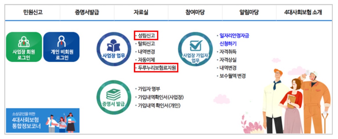 - 미가입 사업장 : 4대사회보험 정보연계센터 홈페이지 > 사업장 업무 > 성립신고 (두루누리보험료지원 체크)